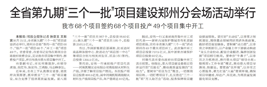 8月15日,全省第九期“三个一批”项目建设活动举行,郑州分会场“签约一批”项目68个、“投产一批”项目68个、“开工一批”项目49个。省委常委、市委书记安伟在郑州分会场收听收看会议,见证我市项目集中签约、察看投产项目,并宣布我市重大项目集中开工。