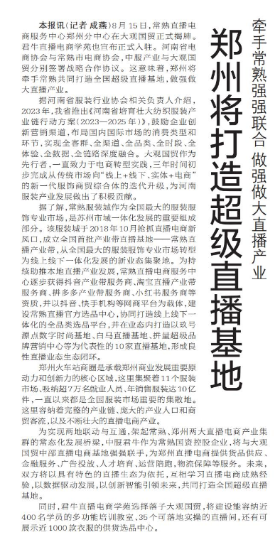 8月15日,常熟直播电商服务中心郑州分中心在大观国贸正式揭牌。君牛直播电商学苑也宣布正式入驻。河南省电商协会与常熟市电商协会,中服产业与大观国贸分别签署战略合作协议。这意味着,郑州将牵手常熟共同打造全国超级直播基地,做强做大直播产业。(今日《郑州日报》2版)