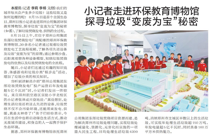 我们的城市每天会产生多少垃圾?这些垃圾又是如何处理的呢? 8月15日是首个全国生态日,郑州日报小记者走进郑州公用集团环保教育博物馆,探寻垃圾“变废为宝”的秘密,了解垃圾焚烧发电、供热的全过程。(今日《郑州日报》2版)