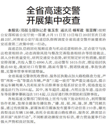 按照公安部和省公安厅统一部署,8月11日至13日每日20时至次日凌晨2时,河南省公安厅高速总队指挥调度全省高速交警开展夏夜治安巡查第二次集中统一行动。(今日《郑州日报》2版)