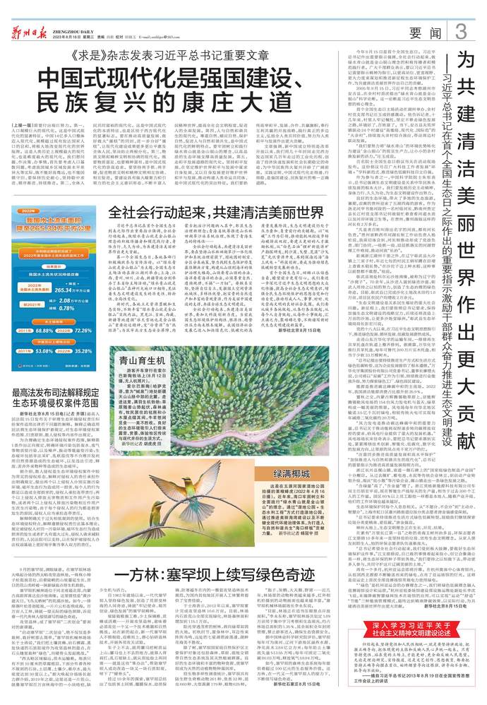 今年8月15日是首个全国生态日。习近平总书记作出重要指示强调,全社会行动起来,做绿水青山就是金山银山理念的积极传播者和模范践行者。广大干部群众表示,要以习近平总书记重要指示精神为指引,以更高站位、更宽视野、更大力度来谋划和推进新征程生态环境保护工作,为共建清洁美丽世界作出自己的贡献。(今日《人民日报》1版、2版)