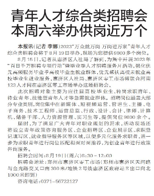 2023“万众就万岗 万岗进万家”青年人才综合类招聘会将于8月19日举办,现场为您提供9800多个岗位。(今日《郑州日报》5版)