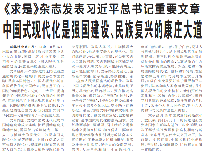 8月16日出版的第16期《求是》杂志将发表中共中央总书记、国家主席、中央军委主席习近平的重要文章《中国式现代化是强国建设、民族复兴的康庄大道》。