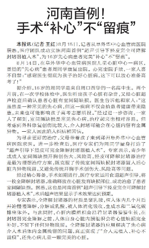 8月15日,记者从阜外华中心血管病医院获悉,医疗团队成功实施河南首例“超声引导下经皮完全可降解封堵器植入术”,为16岁先心病患者完美“补心”不“留痕”。(今日《郑州日报》5版)
