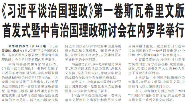 14日,《习近平谈治国理政》第一卷斯瓦希里文版首发式暨中肯治国理政研讨会在肯尼亚首都内罗毕举行。