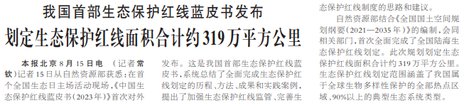 记者15日从自然资源部获悉:在首个全国生态日主场活动现场,《中国生态保护红线蓝皮书(2023年)》首次对外发布。这是我国首部生态保护红线蓝皮书,系统总结了全面完成生态保护红线划定的历程、方法、成果和实践案例,提出了加强生态保护红线监管、完善生态保护红线制度的思路和建议。(今日《人民日报》1版)