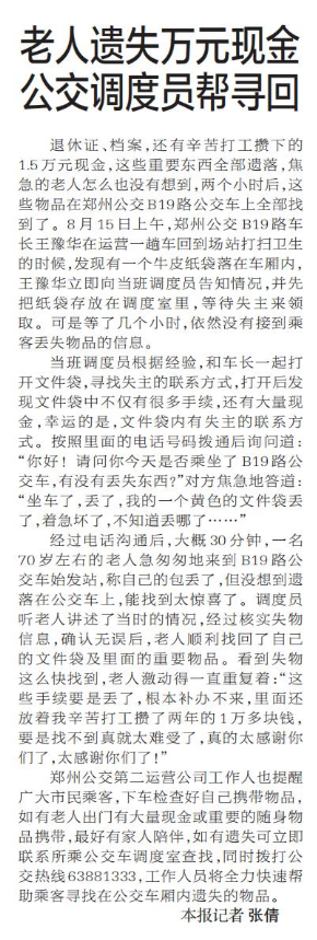 老人遗失万元现金公交调度员帮寻回