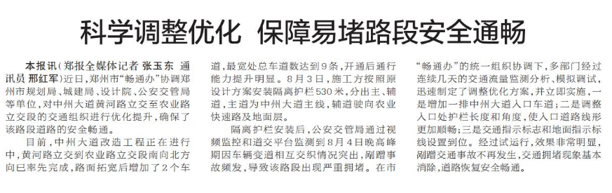 近日,郑州市“畅通办”协调郑州市规划局、城建局、设计院、公安交管局等单位,对中州大道黄河路立交至农业路立交段的交通组织进行优化提升,确保了该路段道路的安全畅通。(今日《郑州日报》5版)
