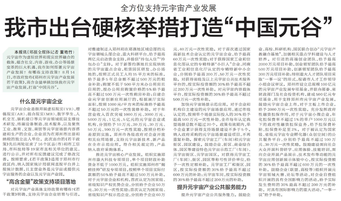 元宇宙作为虚拟世界和现实世界融合的载体,蕴含社交、内容、游戏、办公等场景变革的巨大机遇,我市如何部署元宇宙产业发展?有哪些支持政策?8月14日,市政府发布《郑州市元宇宙产业发展若干政策》,高含金量举措加快我市元宇宙产业发展,打造“中国元谷”。(今日《郑州日报》6版)