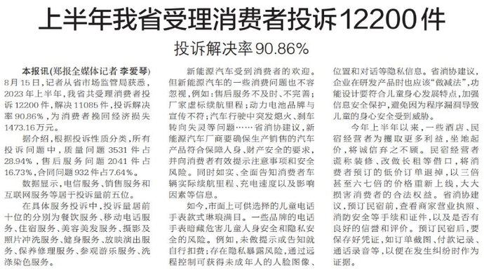 8月15日,记者从省市场监管局获悉,2023年上半年,我省共受理消费者投诉12200件,解决11085件,投诉解决率90.86%,为消费者挽回经济损失1473.16万元。(今日《郑州日报》6版)