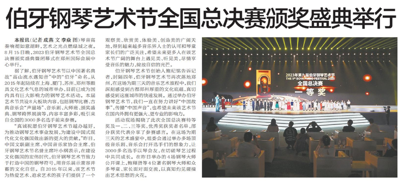 琴音高奏响彻如意湖畔,艺术之光点燃绿城之夜。8月15日晚,2023伯牙钢琴艺术节全国总决赛颁奖盛典暨闭幕式在郑州国际会展中心举行。(今日《郑州日报》8版)