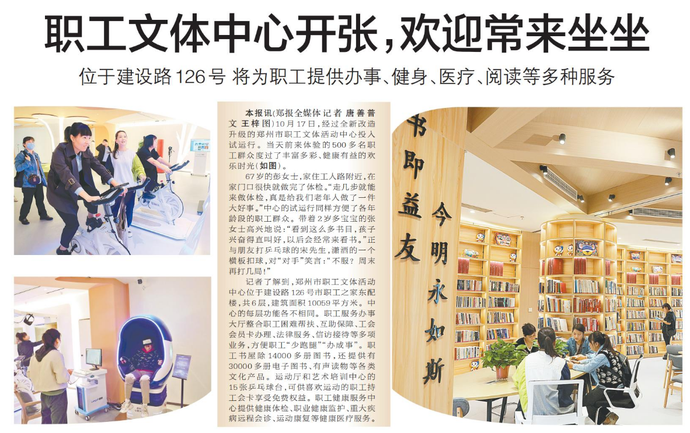 10月17日,经过全新改造升级的郑州市职工文体活动中心投入试运行。当天前来体验的500多名职工群众度过了丰富多彩、健康有益的欢乐时光。(今日《郑州日报》2版)