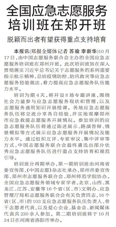 10月17日,由中国志愿服务联合会主办的全国应急志愿服务培训班在郑州开班。此次培训班旨在深入贯彻落实习近平总书记关于志愿服务的系列重要指示批示精神,总结疫情防控、防汛救灾等应急志愿服务经验做法,着力提高应急志愿服务队伍能力水平。(今日《郑州日报》2版)