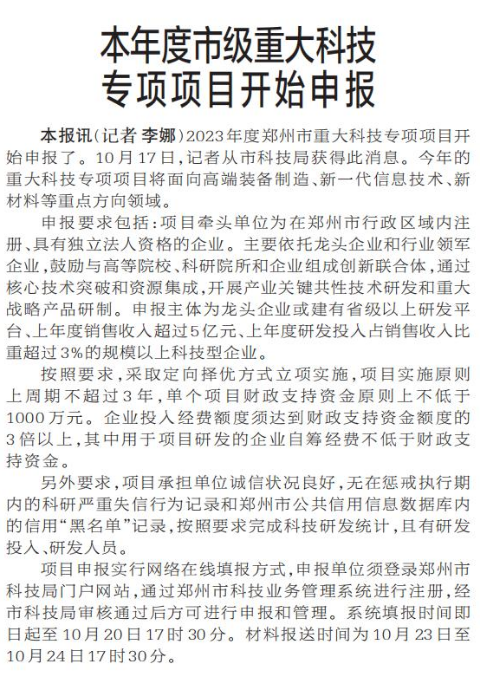 2023年度郑州市重大科技专项项目开始申报了。10月17日,记者从市科技局获得此消息。今年的重大科技专项项目将面向高端装备制造、新一代信息技术、新材料等重点方向领域。(今日《郑州日报》2版)