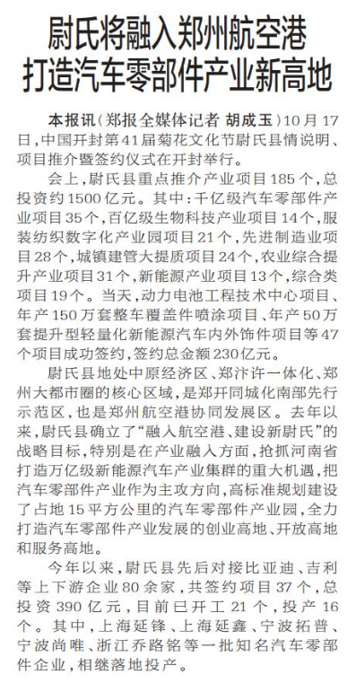 尉氏将融入郑州航空港 打造汽车零部件产业新高地