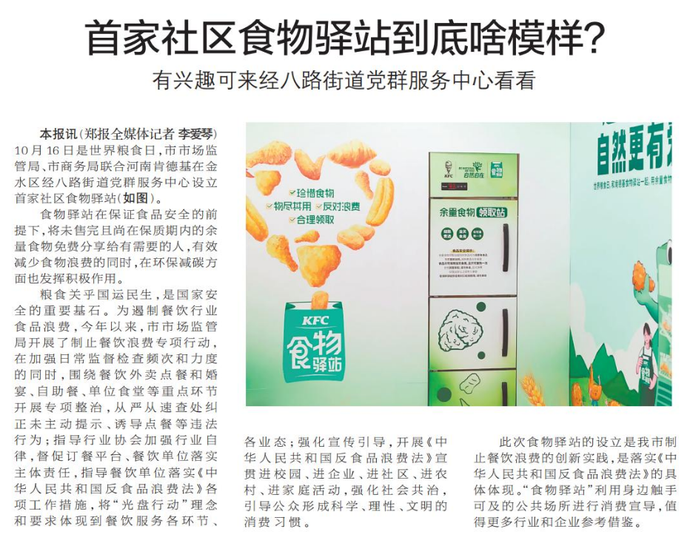 10月16日是世界粮食日,市市场监管局、市商务局联合河南肯德基在金水区经八路街道党群服务中心设立首家社区食物驿站。(今日《郑州日报》2版)