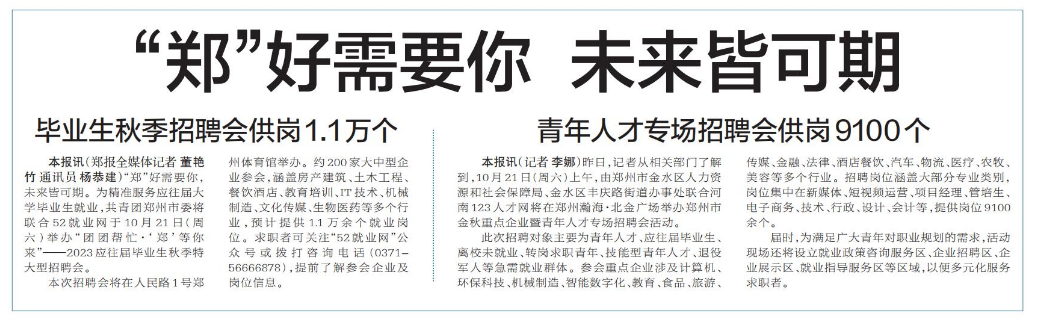 “郑”好需要你,未来皆可期。为精准服务应往届大学毕业生就业,共青团郑州市委将联合52就业网于10月21日(周六)举办“团团帮忙·‘郑’等你来”——2023应往届毕业生秋季特大型招聘会。(今日《郑州日报》5版)