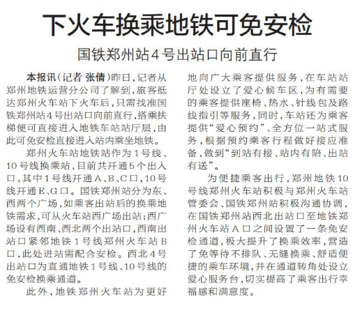 昨日,记者从郑州地铁运营分公司了解到,旅客抵达郑州火车站下火车后,只需找准国铁郑州站4号出站口向前直行,搭乘扶梯便可直接进入地铁车站站厅层,由此可免安检直接进入站内乘坐地铁。(今日《郑州日报》5版)