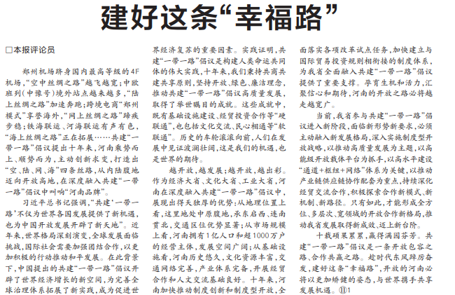 郑州机场跻身国内最高等级的4F机场,“空中丝绸之路”越飞越宽;中欧班列(中豫号)境外站点越来越多,“陆上丝绸之路”加速奔跑;跨境电商“郑州模式”享誉海外,“网上丝绸之路”蹄疾步稳;铁海联运、河海联运有声有色,“海上丝绸之路”正在拓展……共建“一带一路”倡议提出十年来,河南乘势而上、顺势而为,主动创新求变,打造出“空、陆、网、海”四条丝路,从内陆腹地迈向开放高地,在深度融入共建“一带一路”倡议中叫响“河南品牌”。(今日《河南日报》1版)