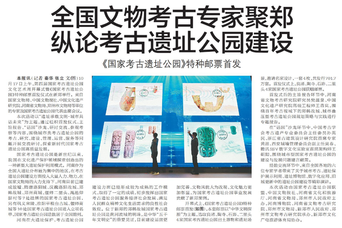 10月17日上午,第四届国家考古遗址公园文化艺术周开幕式暨《国家考古遗址公园》特种邮票首发仪式在新郑举行。来自国家文物局、中国文物报社、中国文化遗产研究院、河南省文物局、郑州市文物局等单位的专家及国家考古遗址公园代表出席会议。(今日《郑州日报》8版)