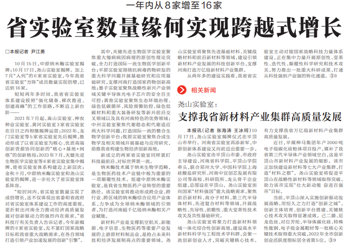 尧山实验室:支撑我省新材料产业集群高质量发展