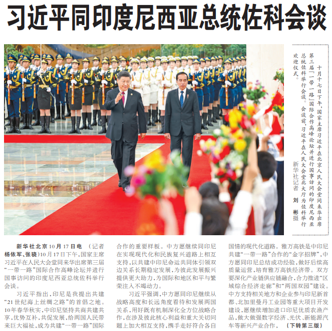 10月17日下午,国家主席习近平在人民大会堂同来华出席第三届“一带一路”国际合作高峰论坛并进行国事访问的印度尼西亚总统佐科举行会谈。(今日《人民日报》1版、3版)