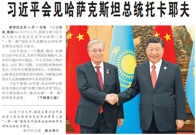 10月17日上午,国家主席习近平在人民大会堂会见来华出席第三届“一带一路”国际合作高峰论坛的哈萨克斯坦总统托卡耶夫。(今日《人民日报》2版、3版)