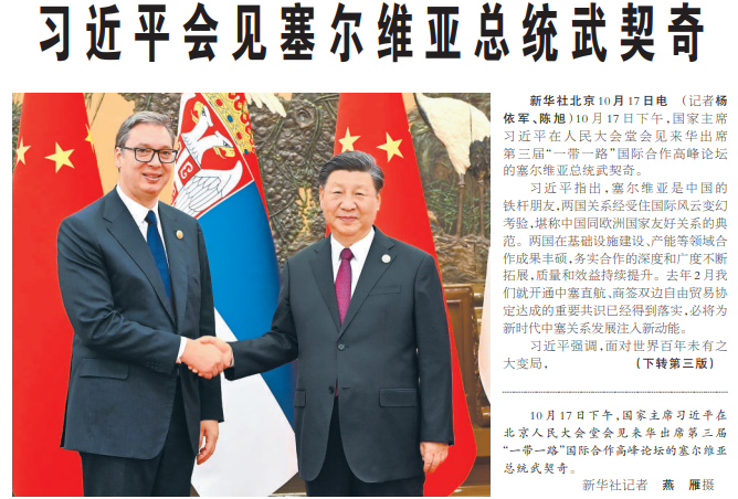 10月17日下午,国家主席习近平在人民大会堂会见来华出席第三届“一带一路”国际合作高峰论坛的塞尔维亚总统武契奇。(今日《人民日报》2版、3版)
