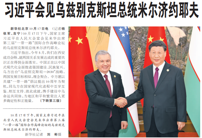 10月17日下午,国家主席习近平在人民大会堂会见来华出席第三届“一带一路”国际合作高峰论坛的乌兹别克斯坦总统米尔济约耶夫。(今日《人民日报》2版、3版)