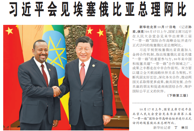 10月17日上午,国家主席习近平在人民大会堂会见来华出席第三届“一带一路”国际合作高峰论坛并进行正式访问的埃塞俄比亚总理阿比。(今日《人民日报》2版、3版)