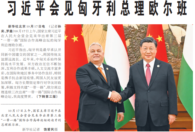 10月17日上午,国家主席习近平在人民大会堂会见来华出席第三届“一带一路”国际合作高峰论坛的匈牙利总理欧尔班。(今日《人民日报》2版、3版)