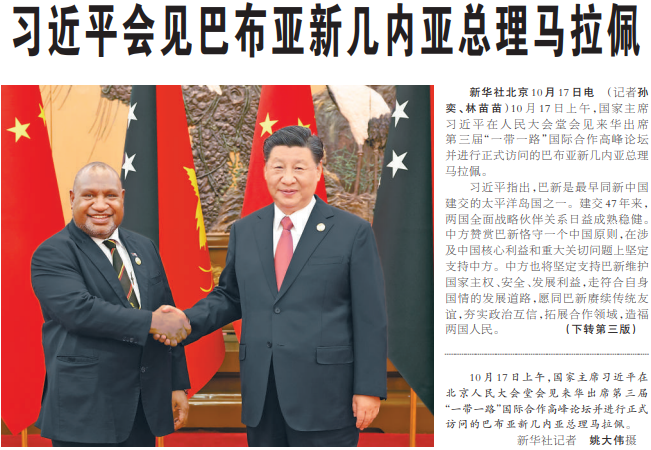 10月17日上午,国家主席习近平在人民大会堂会见来华出席第三届“一带一路”国际合作高峰论坛并进行正式访问的巴布亚新几内亚总理马拉佩。(今日《人民日报》2版、3版)