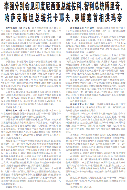 国务院总理李强10月17日上午在钓鱼台国宾馆会见来华出席第三届“一带一路”国际合作高峰论坛并进行国事访问的印度尼西亚总统佐科。(今日《人民日报》4版)