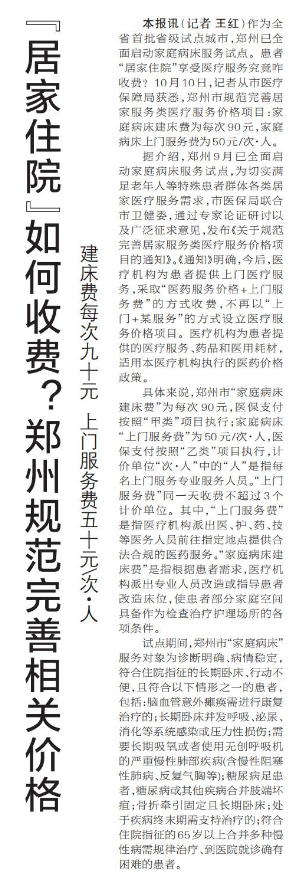 作为全省首批省级试点城市,郑州已全面启动家庭病床服务试点。患者“居家住院”享受医疗服务究竟咋收费?10月10日,记者从市医疗保障局获悉,郑州市规范完善居家服务类医疗服务价格项目:家庭病床建床费为每次90元,家庭病床上门服务费为50元/次·人。(今日《郑州日报》1版)