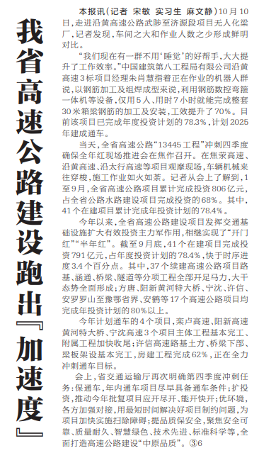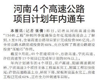 昨日,记者从河南高速公路“13445工程”冲刺四季度确保全年红现场推进会上了解到,1至9月,全省高速公路项目累计完成投资806亿元,占全省公路水路完成投资的68%,充分发挥了高速公路建设投资“压舱石”作用。(今日《郑州日报》1版)