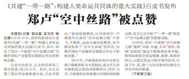 10月10日,国务院新闻办公室发布《共建“一带一路”:构建人类命运共同体的重大实践》白皮书,其中,肯定了郑州-卢森堡“空中丝绸之路”为维护国际产业链供应链稳定作出的积极贡献。(今日《河南日报》1版、3版)