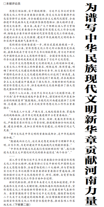 思想引领征程,实干铸就辉煌。习近平总书记对宣传思想文化工作作出重要指示强调,坚定文化自信秉持开放包容坚持守正创新,为全面建设社会主义现代化国家、全面推进中华民族伟大复兴提供坚强思想保证、强大精神力量、有利文化条件。连日来,我省广大干部群众深入学习贯彻习近平总书记重要指示和全国宣传思想文化工作会议精神,纷纷表示要不断开创新时代宣传思想文化工作新局面,在建设社会主义文化强国、建设中华民族现代文明的奋斗和实践中展现新气象新作为。(今日《河南日报》1版、2版)