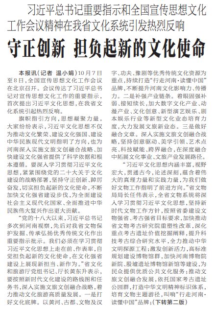 10月7日至8日,全国宣传思想文化工作会议在北京召开。会议传达了习近平总书记对宣传思想文化工作的重要指示,首次提出习近平文化思想,在我省文化系统引起热烈反响。(今日《河南日报》1版、2版)