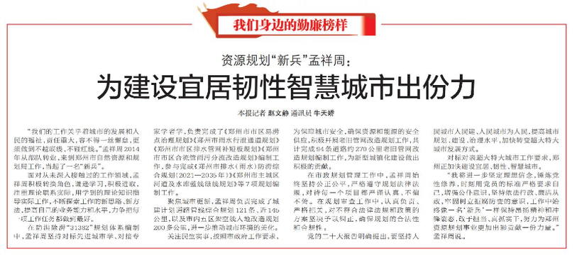 “我们的工作关乎着城市的发展和人民的福祉,责任重大,容不得一丝懈怠,更须做到不越底线、不碰红线。”孟祥周2014年从部队转业,来到郑州市自然资源和规划局工作,当起了一名“新兵”。(今日《郑州日报》2版)
