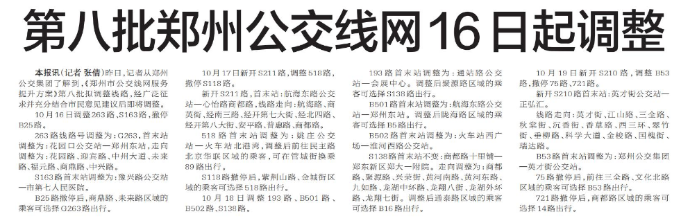 昨日,记者从郑州公交集团了解到,《郑州市公交线网服务提升方案》第八批拟调整线路,经广泛征求并充分结合市民意见建议后即将调整。(今日《郑州日报》5版)