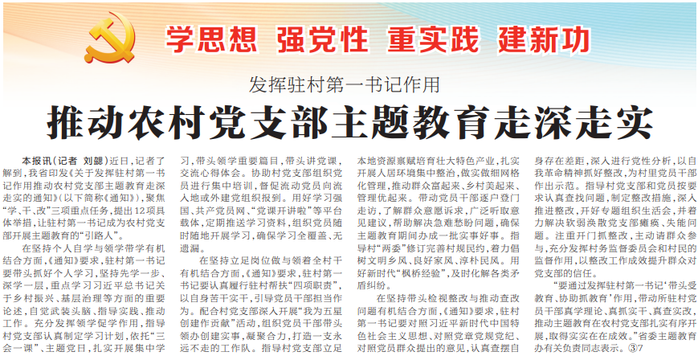 近日,记者了解到,我省印发《关于发挥驻村第一书记作用推动农村党支部主题教育走深走实的通知》,聚焦“学、干、改”三项重点任务,提出12项具体举措,让驻村第一书记成为农村党支部开展主题教育的“引路人”。(今日《河南日报》2版)