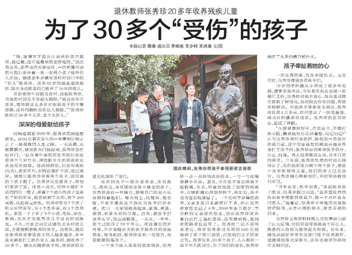 “瞧,玻璃罩下面坑洼起伏的是古舆图,据记载,这可是最早的世界地图。”国庆节这天,新密市古县衙景区,一位和蔼可亲的白发妇女带着一男一女两个孩子格外引人注目。她就是牛店镇宝泉村村民口中的“好人”张秀珍。现年62岁的她是退休教师,跟在身边的是自己收养了16年的孤儿。(今日《郑州日报》7版)