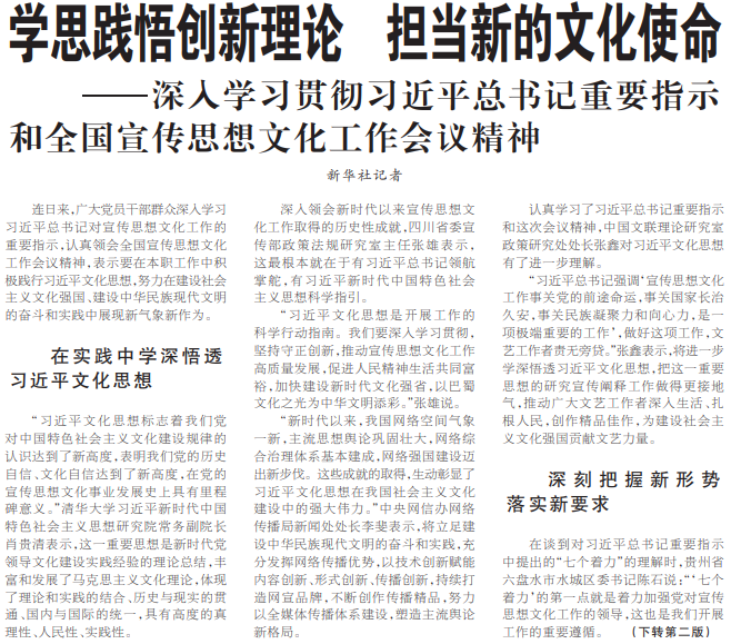 连日来,广大党员干部群众深入学习习近平总书记对宣传思想文化工作的重要指示,认真领会全国宣传思想文化工作会议精神,表示要在本职工作中积极践行习近平文化思想,努力在建设社会主义文化强国、建设中华民族现代文明的奋斗和实践中展现新气象新作为。(今日《人民日报》1版、2版)