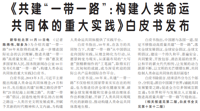 为介绍共建“一带一路”10年来取得的成果,进一步增进国际社会的认识理解,推进共建“一带一路”高质量发展,让“一带一路”惠及更多国家和人民,国务院新闻办公室10日发布《共建“一带一路”:构建人类命运共同体的重大实践》白皮书。(今日《人民日报》1版)
