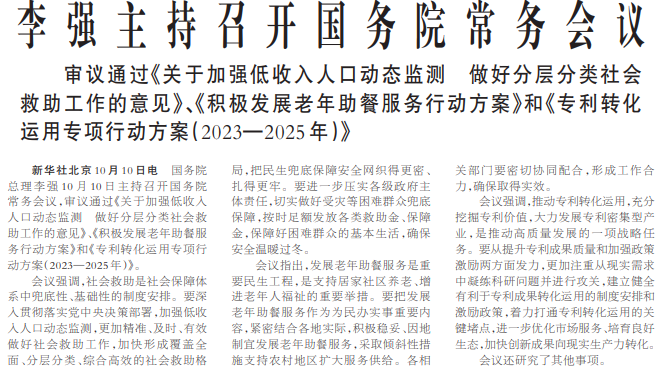 国务院总理李强10月10日主持召开国务院常务会议,审议通过《关于加强低收入人口动态监测 做好分层分类社会救助工作的意见》、《积极发展老年助餐服务行动方案》和《专利转化运用专项行动方案(2023—2025年)》。(今日《人民日报》1版)