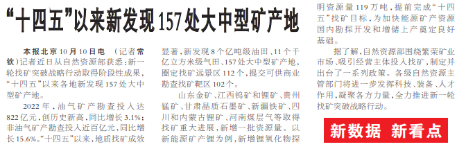 记者近日从自然资源部获悉:新一轮找矿突破战略行动取得阶段性成果,“十四五”以来各地新发现157处大中型矿产地。(今日《人民日报》1版)