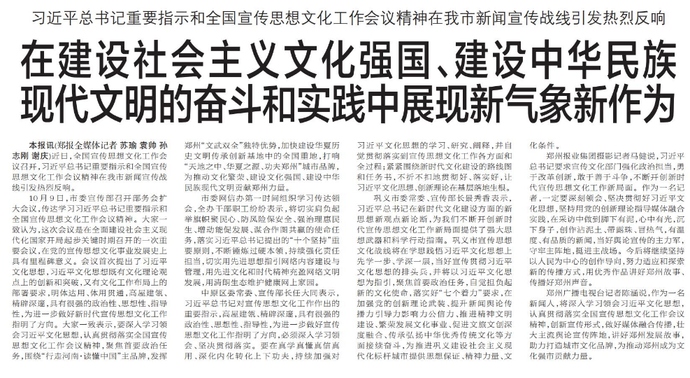 近日,全国宣传思想文化工作会议召开,习近平总书记重要指示和全国宣传思想文化工作会议精神在我市新闻宣传战线引发热烈反响。(今日《郑州日报》2版)