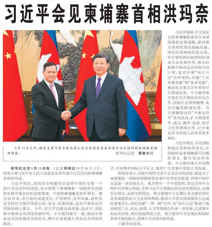 9月15日上午,国家主席习近平在人民大会堂会见来华进行正式访问的柬埔寨首相洪玛奈。(今日《人民日报》1版)