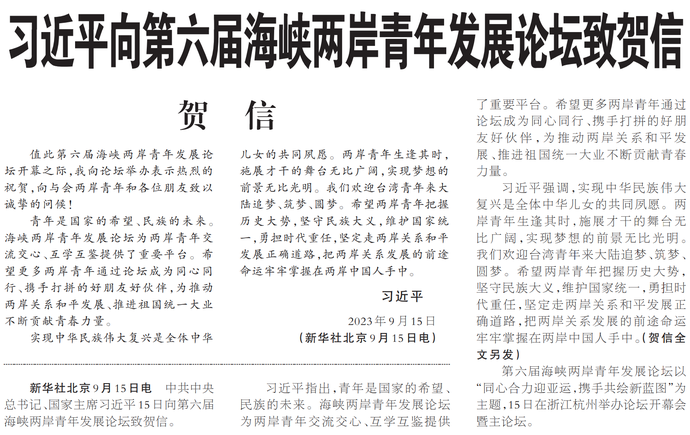 中共中央总书记、国家主席习近平15日向第六届海峡两岸青年发展论坛致贺信。(今日《人民日报》1版)