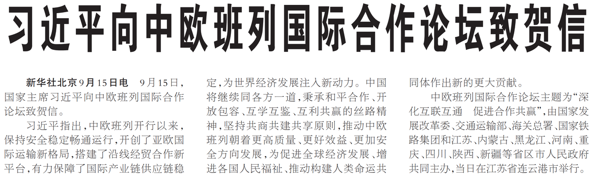 9月15日,国家主席习近平向中欧班列国际合作论坛致贺信。(今日《人民日报》1版)